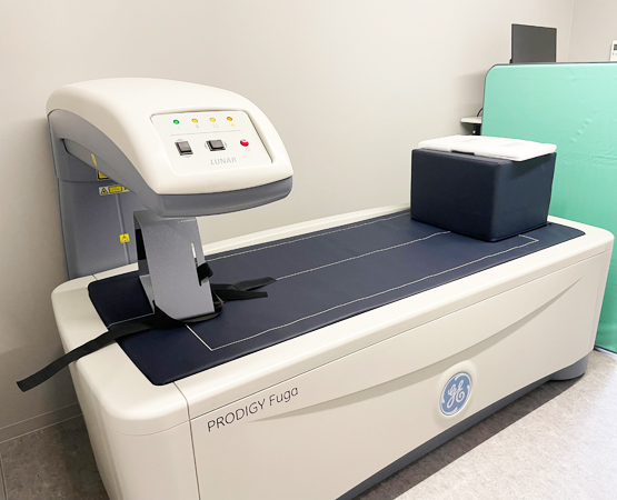 測定部位には腰椎、大腿骨頸部、橈骨遠位部、全身骨があります。特に骨折するリスクの高い腰椎や大腿骨頸部が基本的な測定部位となります。また、全身骨の測定をすることにより、全身の骨ミネラルバランスの評価や体組成(筋肉量・脂肪量)の把握ができます。